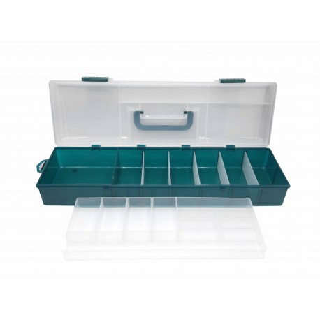 Valigeta din plastic rezistent cu recomandare pentru transport accesorii universale. Beneficiaza de multiple compartimente cu separatoare si un raft suplimentar. Compartimentele pentru depozitare sunt generoase astfel incat ne ajuta la organizarea tuturor accesoriilor necesare unei partide de pescuit astfel incat sa nu ne lipseasca nimic din lucrurile utile.